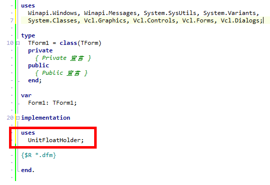 メインフォームから frmFloatHolder を操作できるように、Unit1 の implementation の下の(なければ作成)uses に UnitFloatHolder を追加します。