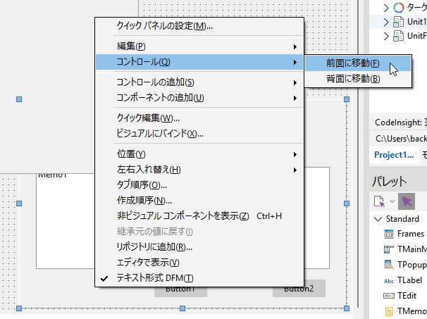 下にいるのもなんなので・・・フローティングパネル(Panel1)を右クリックして、表示されるサブメニューから「コントロール」→「前面に移動」を順にクリック。