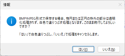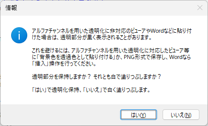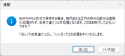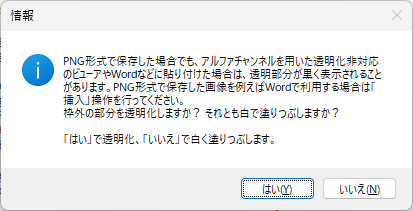 PNG 形式で保存する場合、次のメッセージが表示されます。用途に応じてラバーバンドの枠外の部分を「透明化する」もしくは「白く塗りつぶす」いずれかの処理を選択できます。
