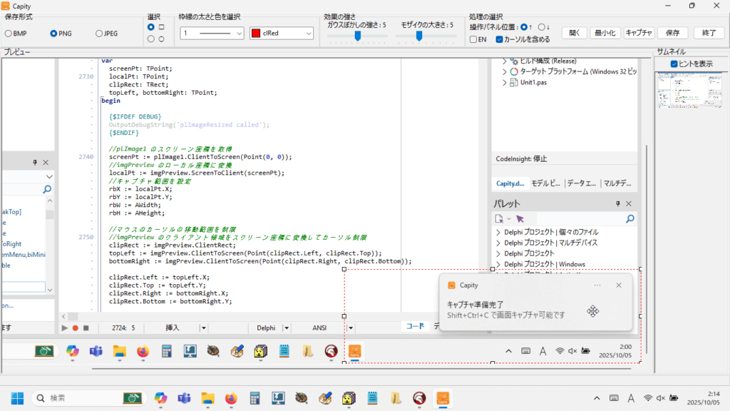 処理可能な画像数は、正直、自分でもよくわかりません。お使いの PC 環境(搭載しているメモリの大きさ等)により変化するものと思われます。保存するファイルの名称は、もちろん任意の名称を付けることも可能ですが、デフォルト設定では「 Screenshot_20251005_032342.png 」のように Screenshot_ に続けて西暦年月日時分秒が自動的に付くので、これまでファイルとして保存する際に面倒に感じていた「名前を付ける」作業から完全に解放されました。作った自分で言うのもナンですが、すごく便利です!!