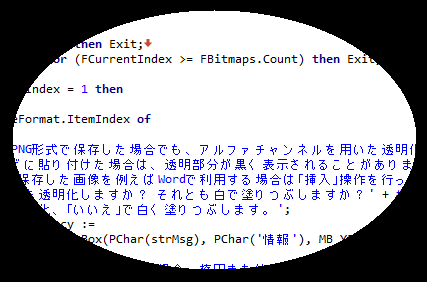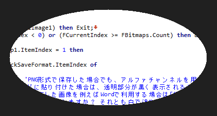 ラバーバンドが円形の場合、画像の保存時には注意が必要です。ラバーバンドの枠の内部の画像のみ保存対象とするのは、画像の形式によらず共通ですが、BMPとJPEG形式で保存する場合、枠外部分の透明化処理は行われず、枠外の部分は「白に塗りつぶされ」て保存されます。