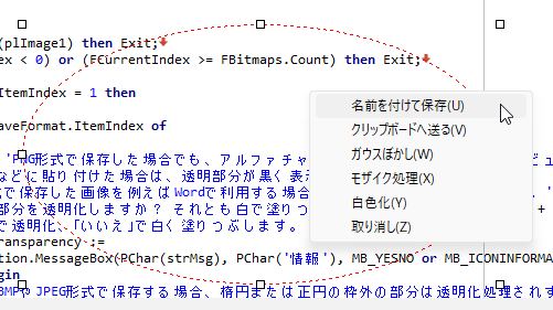 ぼかし加工やモザイク処理を行った画像データが保存できない不具合を修正しました。この修正に合わせて、ぼかし加工やモザイク処理、及び白色化等、画像データを加工した場合は、任意の段階で「保存」ではなく、メモリ上の表示用データに「反映」する機能を追加しました。具体的には、次の通りです。