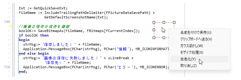 キャプチャした画像の一部をラバーバンドで範囲選択し、選択した範囲内の任意の位置を右クリックすると次のようなサブメニューが表示されます。ここでは、まず、保存の処理から順に説明します。