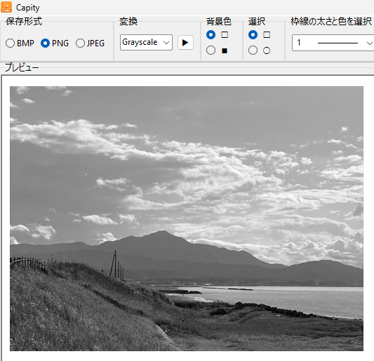 最初は既存の画像を開く処理は不要と考え、実装していませんでしたが、簡単に実装できますし、「ない」よりは「ある」方がいいかと思い直して実装しました。ただ、あくまでもこのプログラムは、「現在表示されている画面を簡単にキャプチャする」ことが主な目的なので、ボタンの位置は深く考えずにほとんどおまけ程度に実装しましたので、ボタン自体の使い勝手はよくないと思います・・・。
