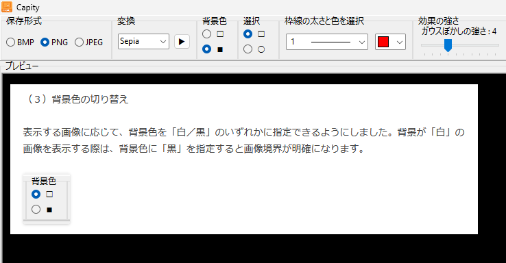 表示する画像に応じて、背景色を「白/黒」のいずれかに指定できるようにしました。背景が「白」の画像を表示する際は、背景色に「黒」を指定すると画像境界が明確になります。