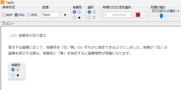 『このアプリは本格的な画像編集に使用するための素材、もしくは、操作方法の解説を作成するために必要な情報画像(部分的な切り抜き画像)を簡単に作成したいという目的を実現するために開発しました。ですので「現在、表示されている画面の全部、もしくは一部を、必要であればマウスカーソルの形状を含めた画像データとして取得する」ことしかできません。保存した画像データを再度読み込んで表示したり、キャプチャした画像を加工する(例えば、ぼかす・モザイクをかけるといったような)機能はありません。ただし、画像の指定範囲を「ぼかす・モザイクをかける」機能は、後日、追加できたら、追加したいと考えています。』