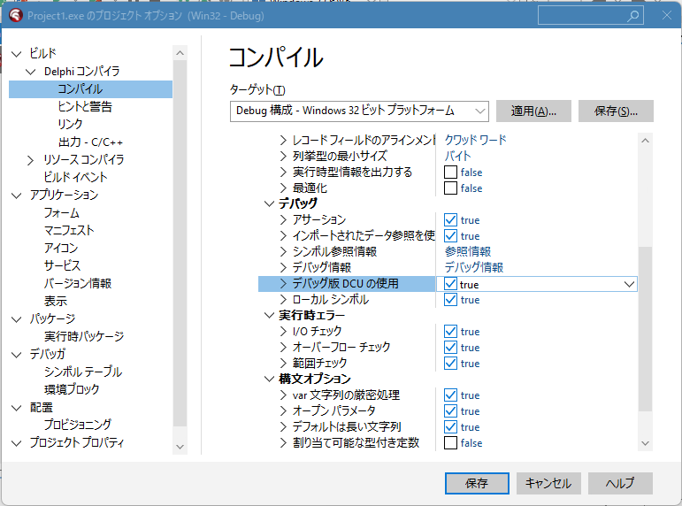 2. 「デバッグ用の .dcu を使用する」をオンにする