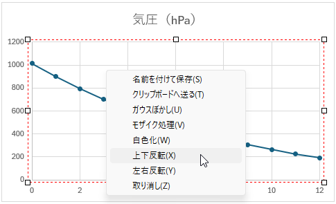 軸の目盛りの数値部分はそのまま、グラフの部分だけをラバーバンドで選択し、その選択した範囲内の任意の位置を右クリックして表示されるサブメニューから「上下反転」を選べば・・・